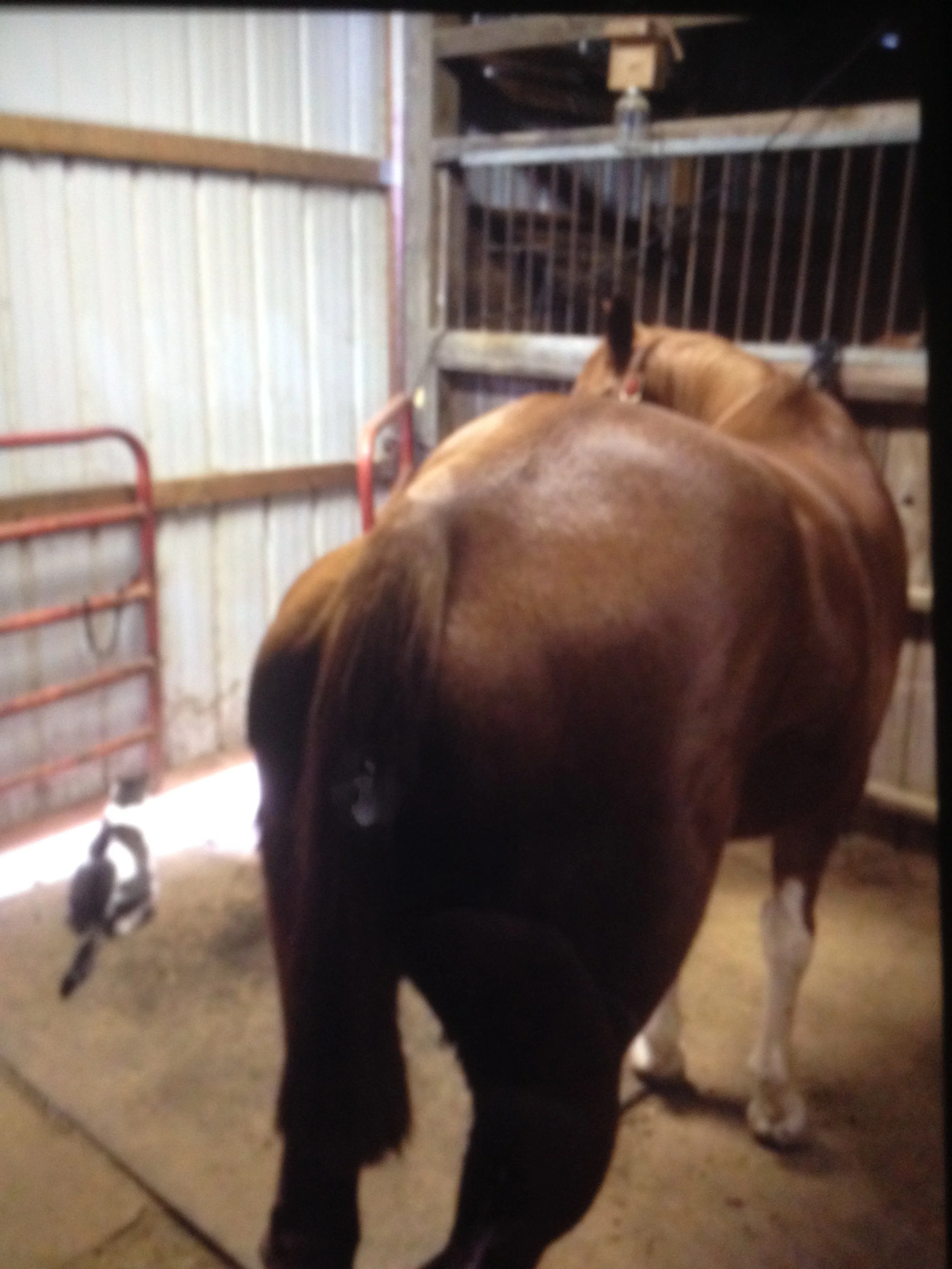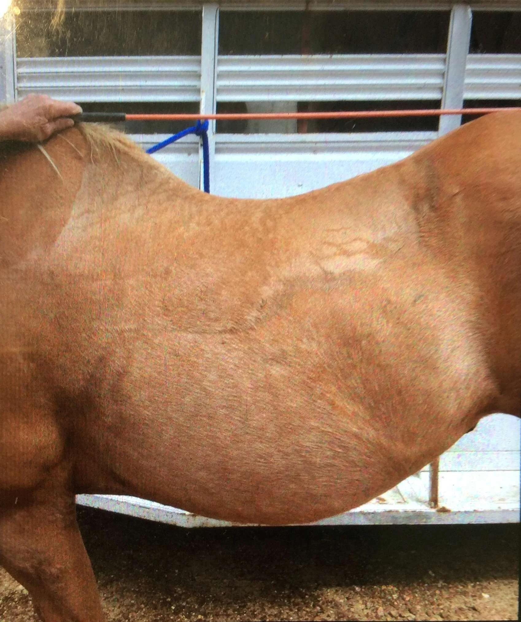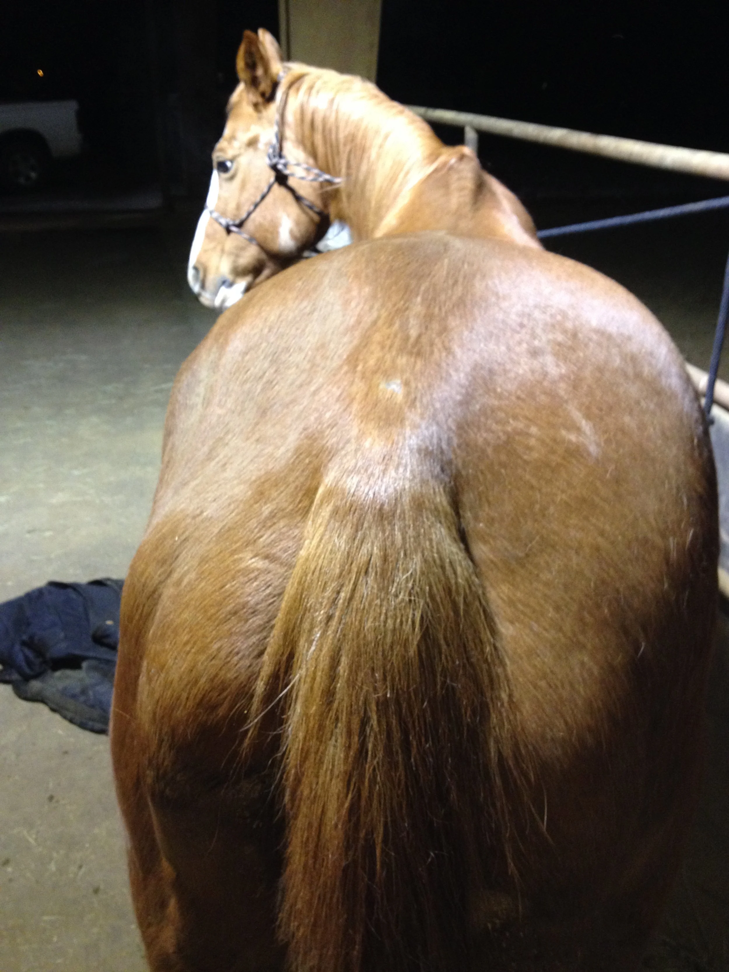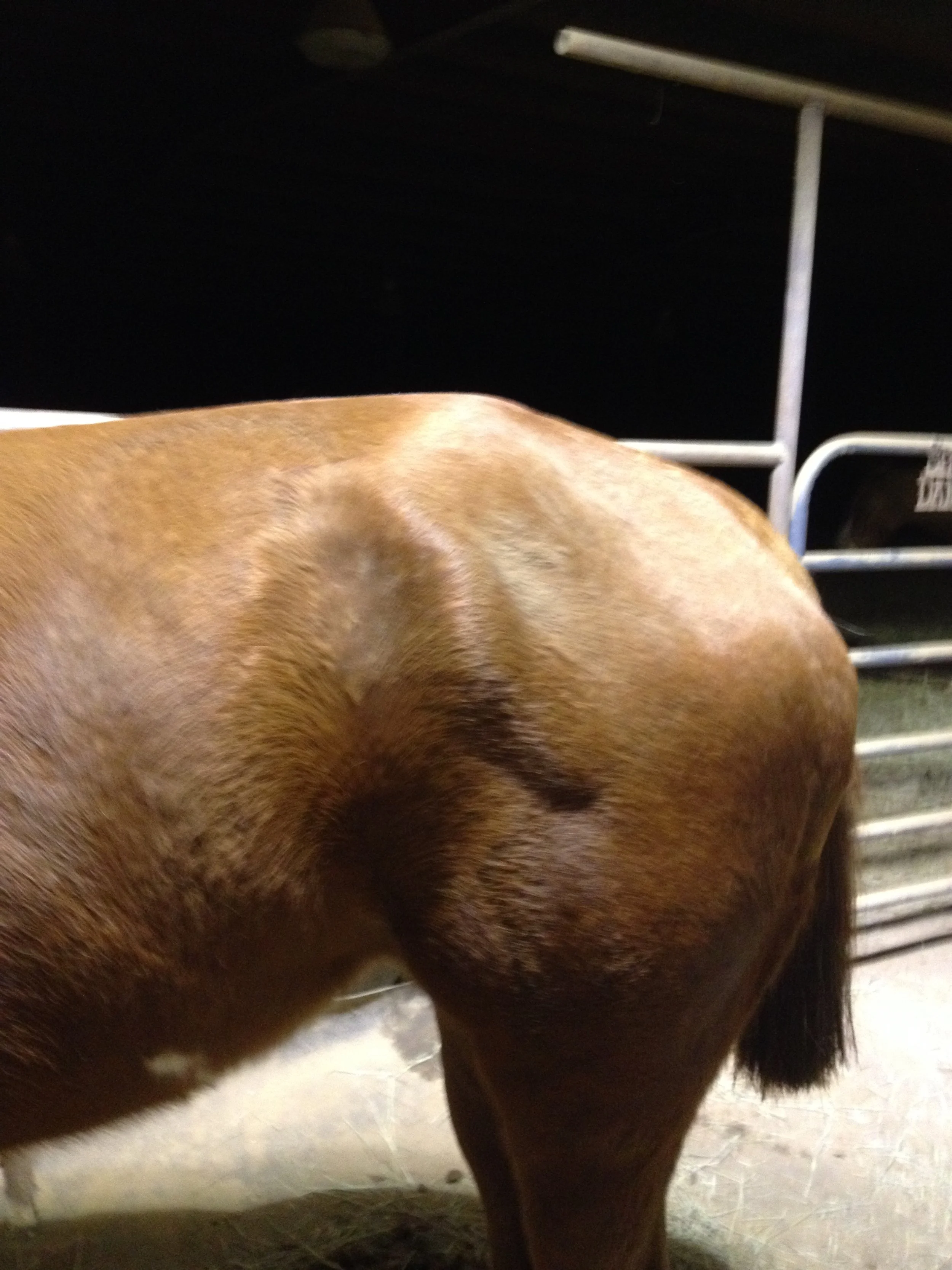 This horse also had sustained a pelvic fracture involving the Lumbosacral Plexus nerves feeding the glutals. The atrophy was pretty severe. After a little over a month, she was well on the road to recovery!