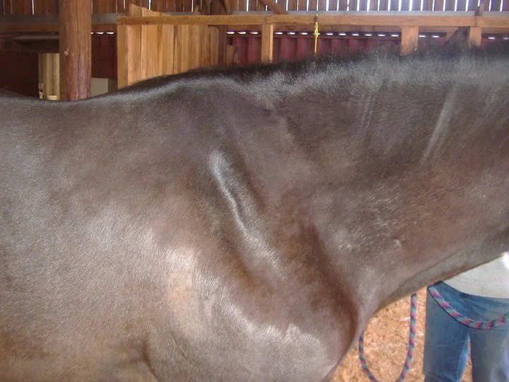 This horse had a subluxation in the right shoulder and a condition known as Sweeney, which causes atrophy of the supraspinous and infraspinous muscles in the shoulder. Realigning the shoulder and resetting the muscle memory was a catalyst to regenerating the muscles in the shoulder.