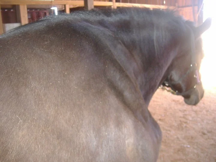 This horse had been slightly ”off”, so the owner had his hocks injected. Afterwards, he became extremely lame and was unable to bend his hind legs. He had been like this for several years. The first day I met him, he had struggled for almost 45 minutes to get up. His pelvic had an almost 3 inch difference, and he was not able to stand without constantly shifting in the hind end.